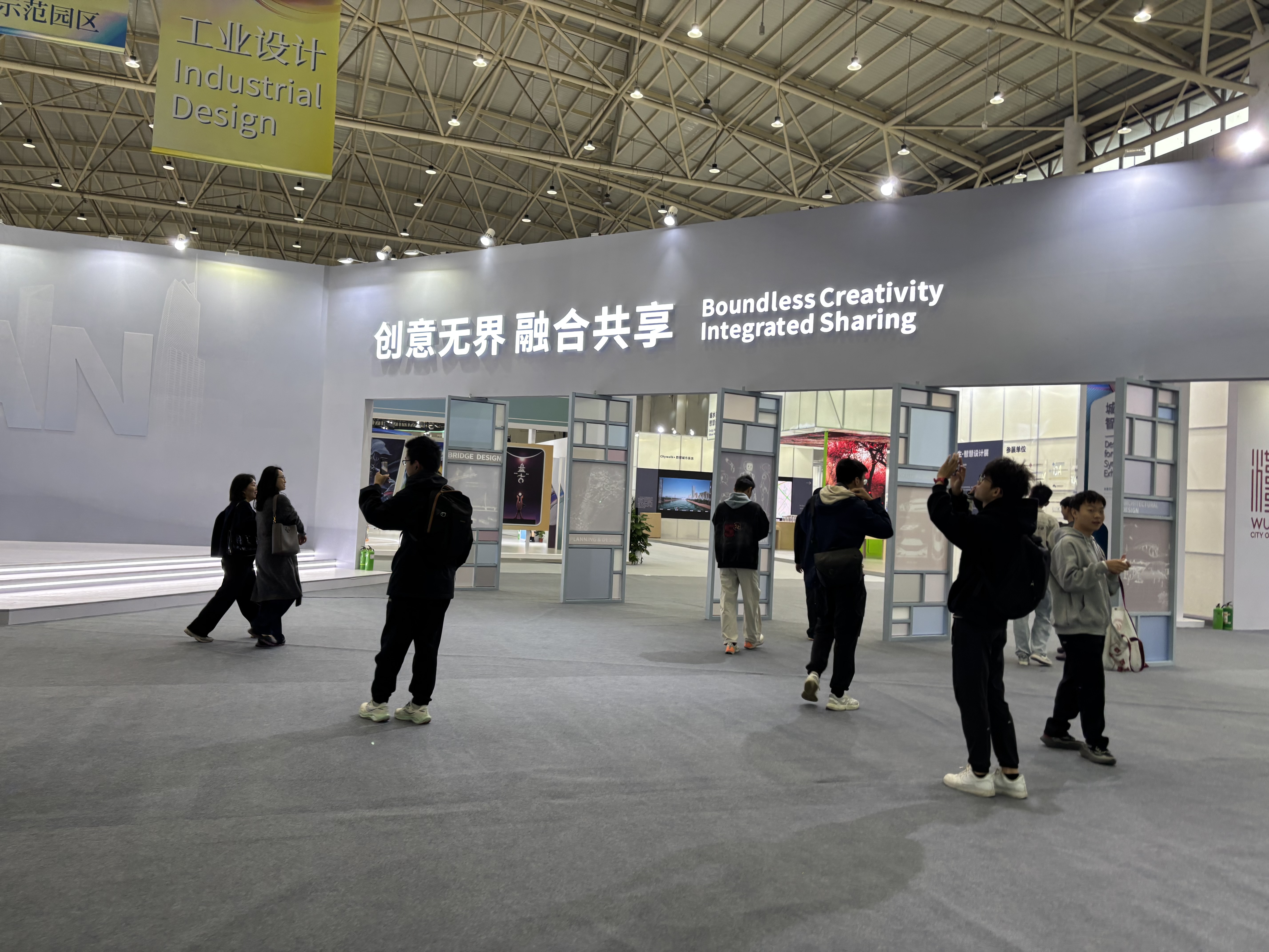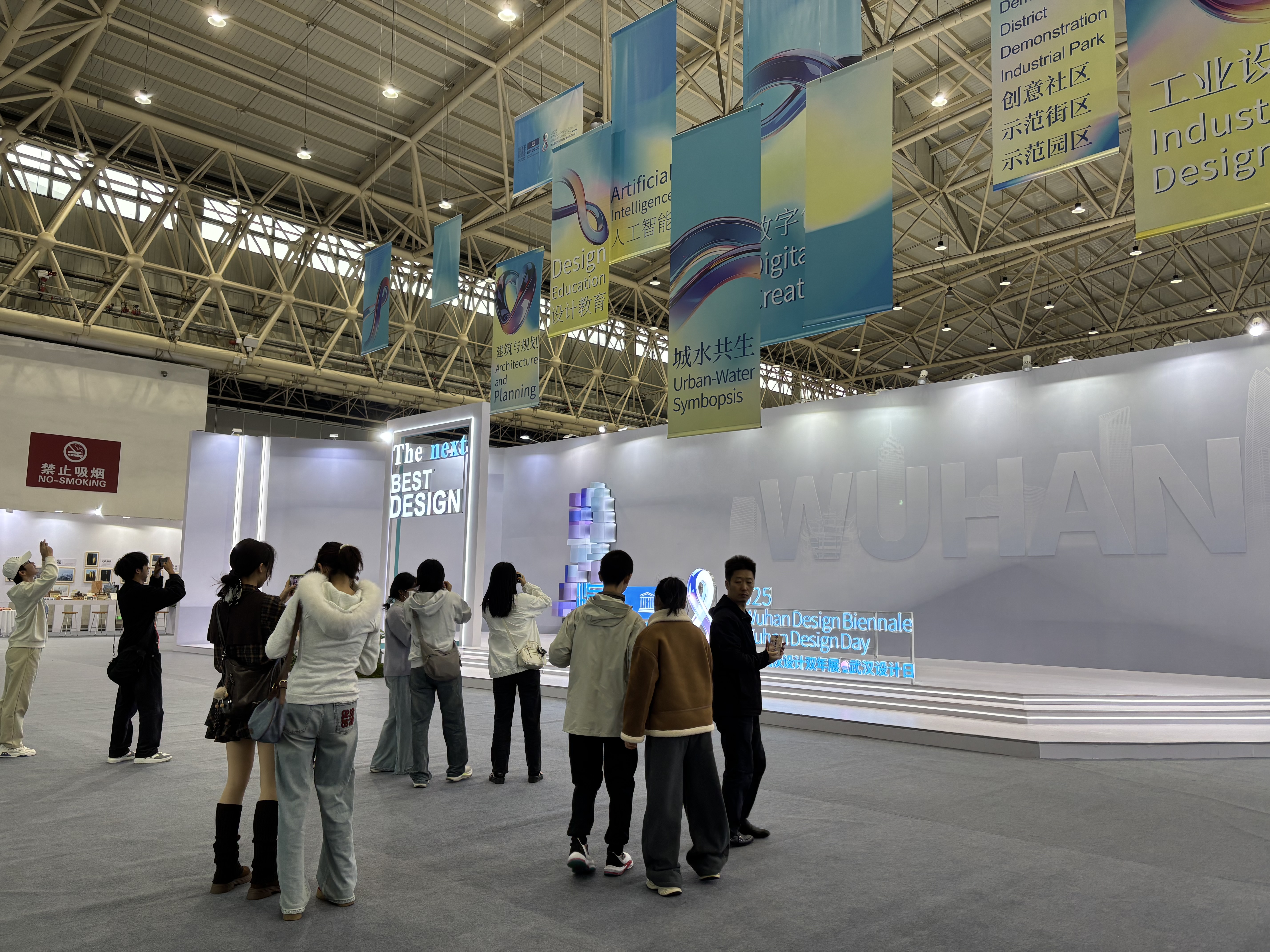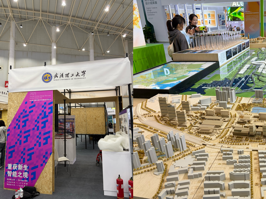 本届武汉设计双年展以“创意无界·融合共享”为核心主题,同学们系统观摩了“城水共生智慧设计展”“建筑与规划前沿设计展”“人工智能创意设计展”“设计教育创新成果展”等七大主题展区。此次双年展将整座武汉化作“流动的设计展厅”,展会现场,人工智能与设计创新的深度融合成为最吸引学子们驻足研讨的焦点。同学们仔细研读了AI驱动的方案生成、数字孪生赋能的城市治理实践案例,并深入学习了隈研吾等国际大师的生态建筑作品,直观领略到“设计+科技”与“设计+生态”的强大跨界魅力。在观摩过程中,同学们循着展会介绍的“百年风貌”“艺术新生”等四大设计漫游路线,在江汉关博物馆的古典肌理与杨泗港长江大桥的现代美学中,深刻体悟武汉作为“设计之都”的历史文脉与硬核实力。