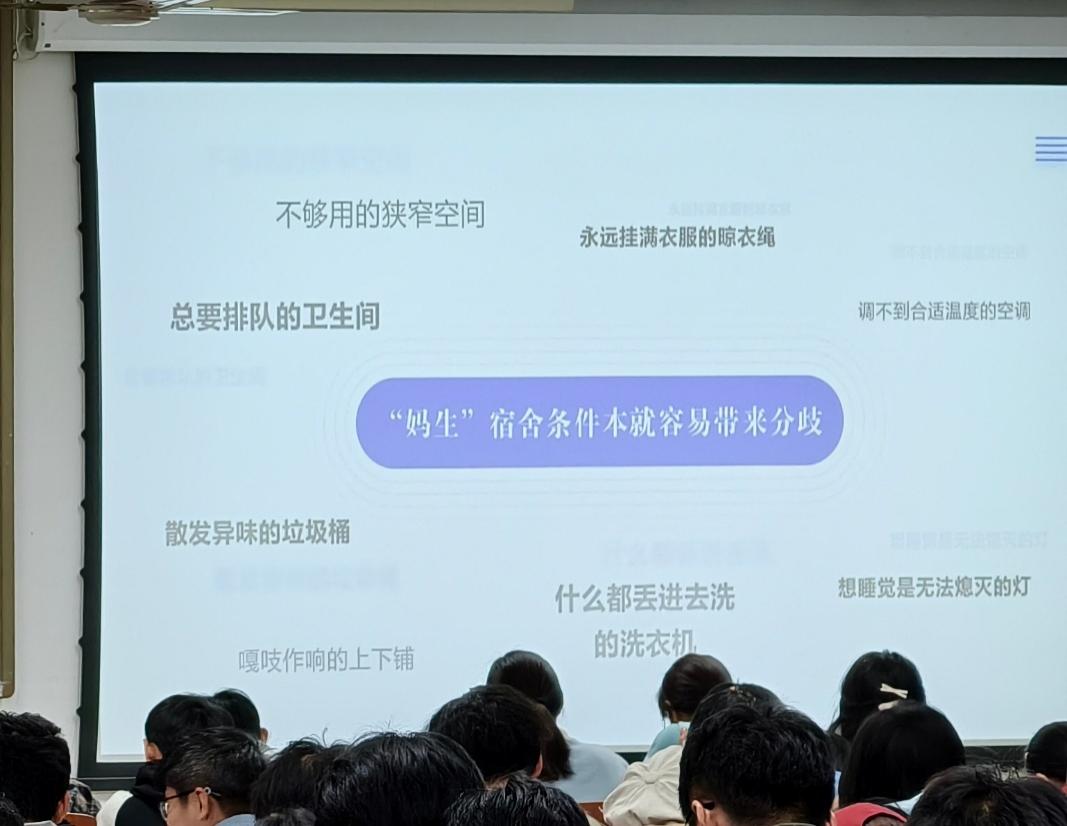 在宿舍矛盾化解板块,胡霞老师以幽默口吻切入,点出宿舍关系“先婚后爱”的特殊性——宿舍关系是“非自然进程发展的关系结果”。她提出:“我们可以允许宿舍关系不完美,但必须掌握冲突解决与和谐相处的能力”,强调良好宿舍关系能提升成员公平感、自我价值感与安全感,值得每个人用心维护。针对“矛盾时该表达还是隐忍”的核心困惑,胡老师给出平衡之道:健康的宿舍关系并非偏向某一极端,而是在表达与包容间灵活变换,既要关注他人感受,也不能忽视自我需求,保持关系的健康张力。