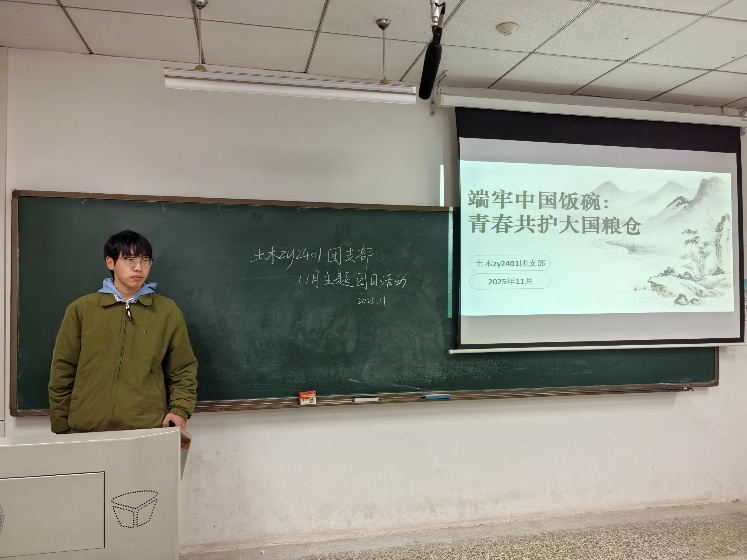为深入学习贯彻习近平总书记关于粮食安全的重要指示精神,引导青年学子树立新时代粮食安全观,2025年11月20日下午,土木卓越2401团支部在博学西楼210教室成功举办"端牢中国饭碗:青春共护大国粮仓"主题团日活动。本次活动由纪律委员汪锦鹏主持,支部全体成员积极参与。