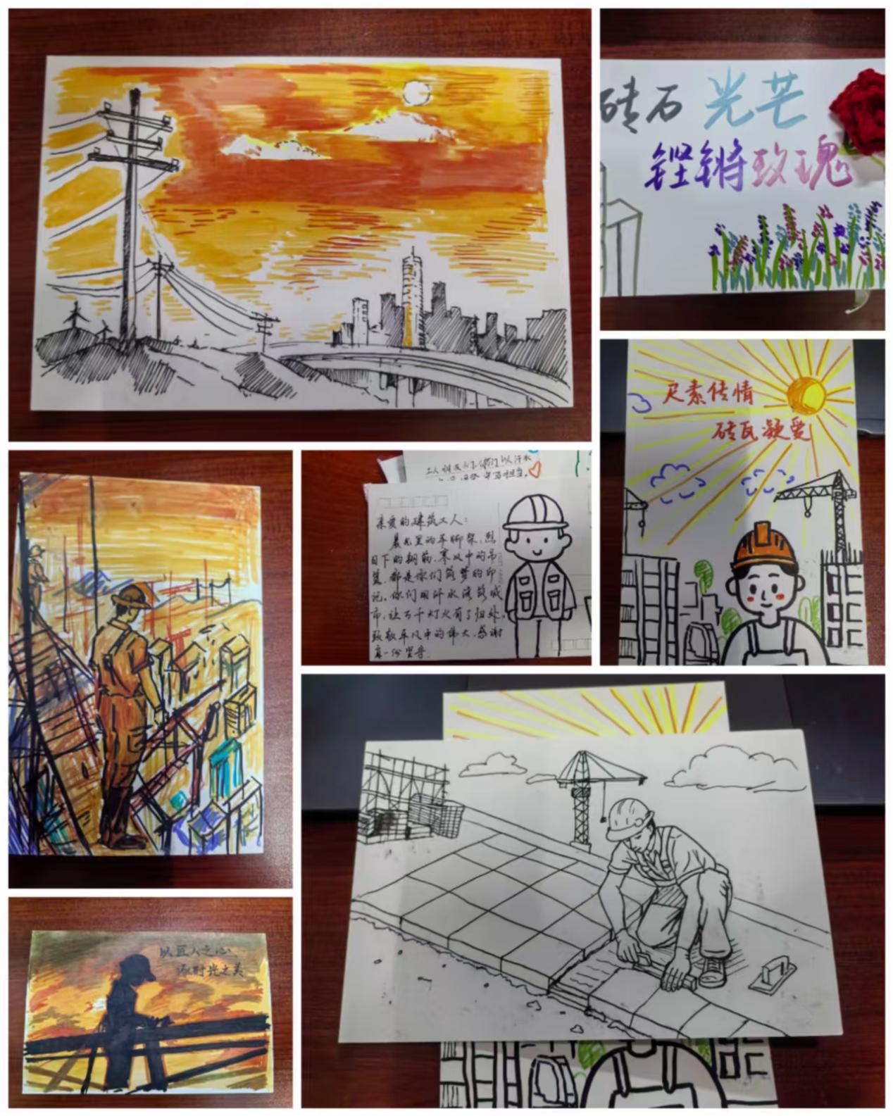 彩笺寄心语,笔墨诉真情。为向建设者们表达深深谢意,学院工程2401团支部同期发起了“砖瓦情深,纸短情长”手写明信片征集活动。同学们踊跃参与,纷纷在卡片上留下真挚话语:“高楼起于匠心,温暖存于善意”擅长绘画的同学还精心绘制了安全帽、建筑蓝图、校园景观等生动图案,让简单的明信片变成充满温度的艺术作品。