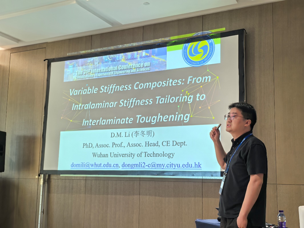 在会议的"复合材料设计、实验与建模的最新进展"分论坛专题研讨会上,李冬明副教授作了题为"变刚度复合材料:从层内刚度调节到层间增韧"的邀请报告。李老师从曲线纤维复合材料概念的提出、纤维路径定义的方法、铺丝装备研发和曲线纤维复合材料的力学性能等多个方面对变刚度曲线纤维复合材料的最新进展进行了梳理,同时也对其课题组在曲线纤维复合材料高保真建模分析方面的最新研究进展进行了分享,这些研究工作包括基于多曲线剪裁技术的复杂孔洞或复杂边界的曲线纤维复合材料层合板/壳等几何分析方法,曲线纤维复合材料板屈曲和后屈曲分析的无网格方法,通过层内曲线纤维设计实现层间增韧的新思路,曲线纤维复合材料层合板低速冲击损伤分析和冲击后压缩损伤容限设计等。李老师的报告引发了与会学者的浓厚兴趣,现场交流热烈。