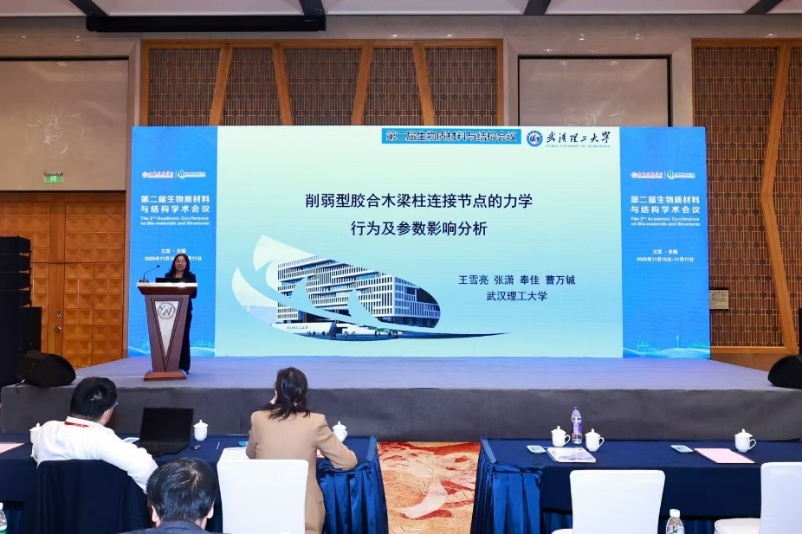 会议通过主旨报告、特邀报告、大会报告等形式,深入探讨了生物质材料与结构的基本理论、加工制备和工程实践等热点问题。我们土木工程系教师王雪亮进行了题为《削弱型胶合木梁柱连接节点的力学行为及参数影响分析》的学术报告,分享了团队在胶合木框架结构抗震性能方面的最新研究成果,得到与会专家的好评与关注。